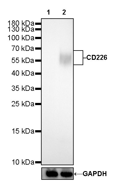 WB result of CD226 Rabbit mAb Primary antibody: CD226 Rabbit mAb at 1/1000 dilution Lane 1: HeLa whole cell lysate 20 µg Lane 2: Jurkat whole cell lysate 20 µg Negative control: HeLa whole cell lysate Secondary antibody: Goat Anti-Rabbit IgG, (H+L), HRP conjugated at 1/10000 dilution Predicted MW: 39 kDa Observed MW: 55~65 kDa