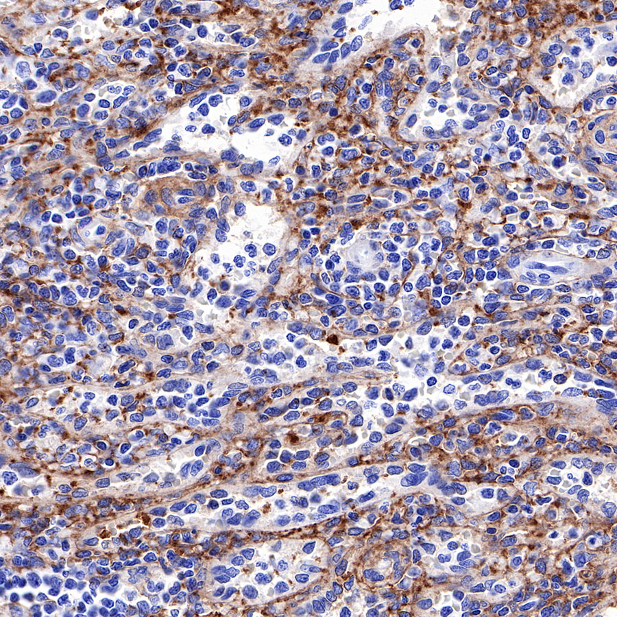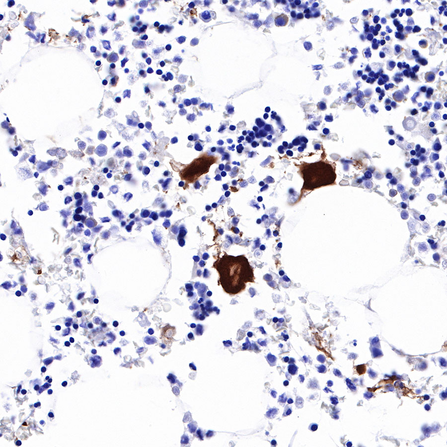 IHC shows positive staining in paraffin-embedded human bone marrow. Anti-CD226 antibody was used at 1/1000 dilution, followed by a HRP Polymer for Mouse & Rabbit IgG (ready to use). Counterstained with hematoxylin. Heat mediated antigen retrieval with Tris/EDTA buffer pH9.0 was performed before commencing with IHC staining protocol.