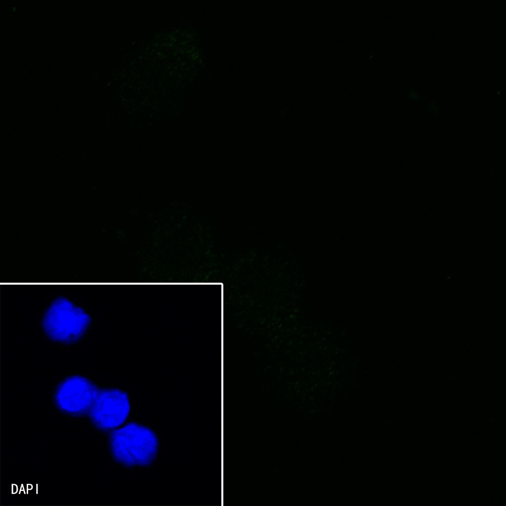 Negative control:ICC shows negative staining in Ramos cells. Anti-CD36 antibody was used at 1/250 dilution and incubated overnight at 4°C. Goat polyclonal Antibody to Rabbit IgG - H&L (Alexa Fluor® 488) was used as secondary antibody at 1/1000 dilution. The cells were fixed with 100% ice-cold methanol and permeabilized with 0.1% PBS-Triton X-100. Nuclei were counterstained with DAPI