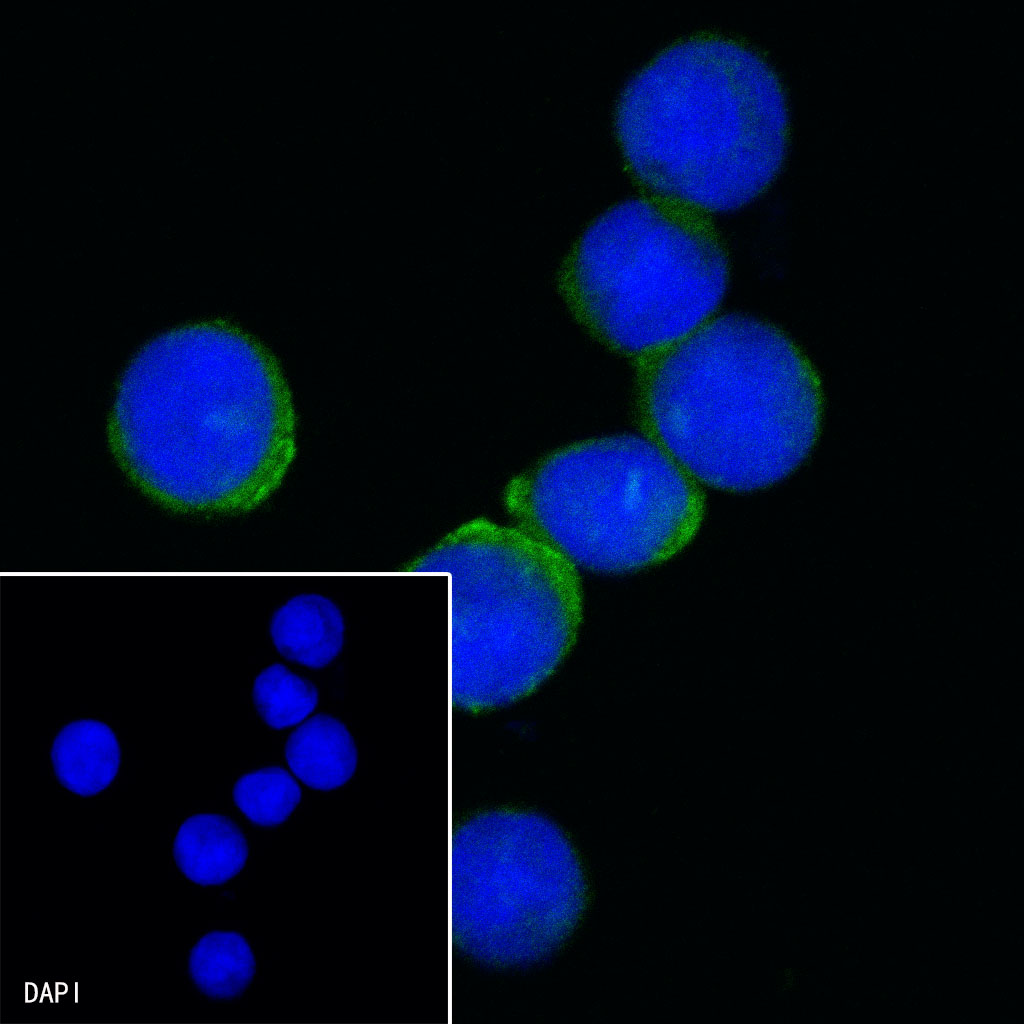 ICC shows positive staining in U937 cells. Anti-CD36 antibody was used at 1/250 dilution (Green) and incubated overnight at 4°C. Goat polyclonal Antibody to Rabbit IgG - H&L (Alexa Fluor® 488) was used as secondary antibody at 1/1000 dilution. The cells were fixed with 100% ice-cold methanol and permeabilized with 0.1% PBS-Triton X-100. Nuclei were counterstained with DAPI