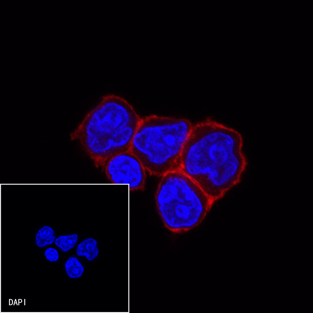 ICC shows positive staining in Ramos cells. Anti-CD38 (Alexa Fluor® 594 Conjugate) antibody was used at 1/200 dilution (Red) and incubated overnight at 4°C. The cells were fixed with 4% PFA and permeabilized with 0.1% PBS-Triton X-100. Nuclei were counterstained with DAPI (Blue).