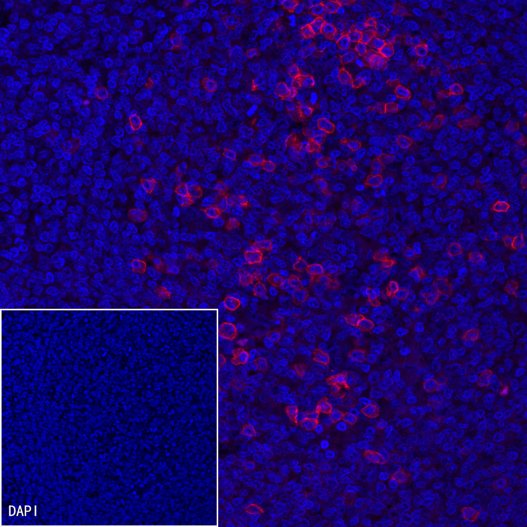 IF shows positive staining in paraffin-embedded human tonsil. Anti-CD38 (Alexa Fluor® 594 Conjugate) antibody was used at 1/200 dilution (Red) and incubated overnight at 4°C. Counterstained with DAPI (Blue). Heat mediated antigen retrieval with EDTA buffer pH9.0 was performed before commencing with IF staining protocol.
