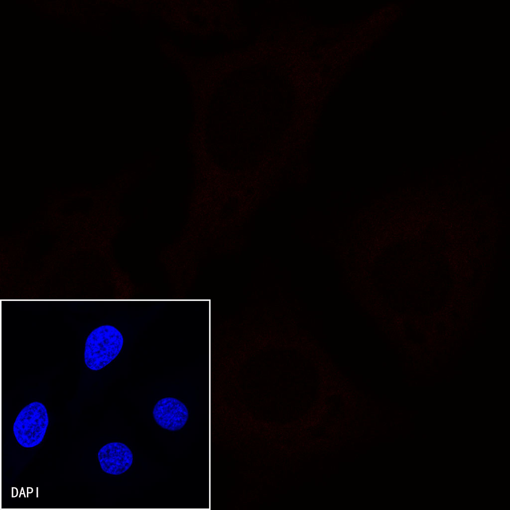 Negative control: ICC shows negative staining in HeLa cells. Anti-CD38 (Alexa Fluor® 594 Conjugate) antibody was used at 1/200 dilution and incubated overnight at 4°C. The cells were fixed with 4% PFA and permeabilized with 0.1% PBS-Triton X-100. Nuclei were counterstained with DAPI (Blue).