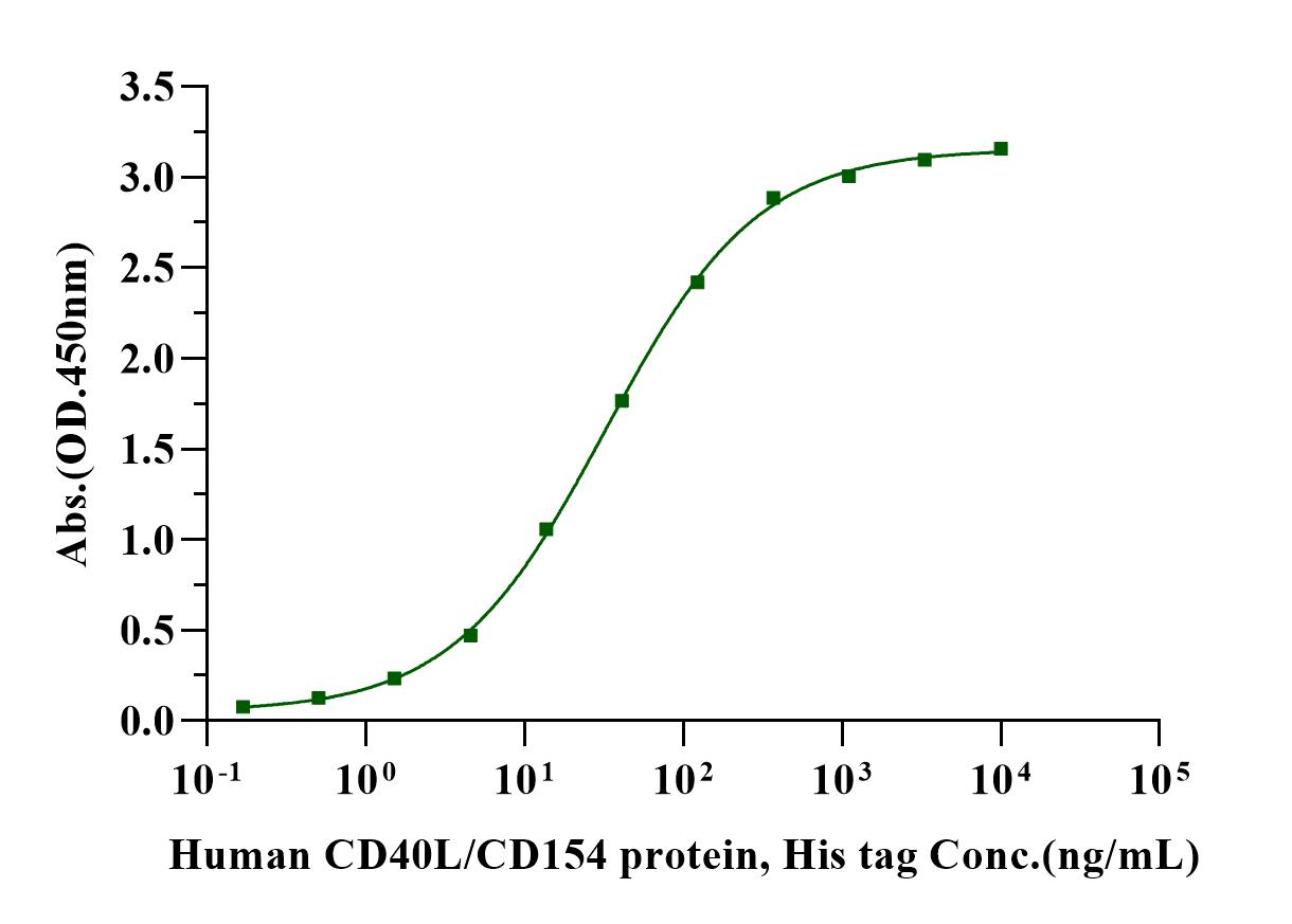 Immobilized CD40 Fc Chimera Protein, Human (Cat. No. UA010194)at 2.0μg/mL (100μL/well) can bind Human CD40L/CD154 protein, His tag with EC50 of 29.70-35.17ng/mL.