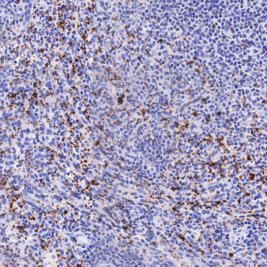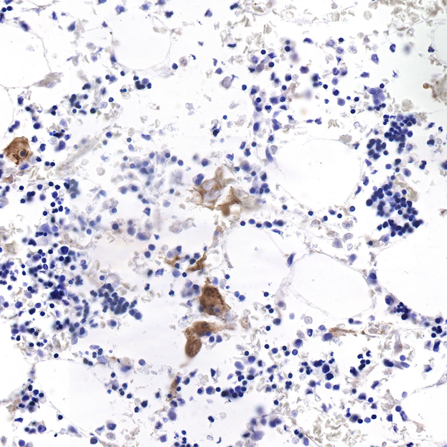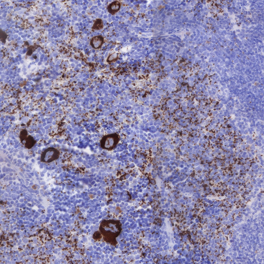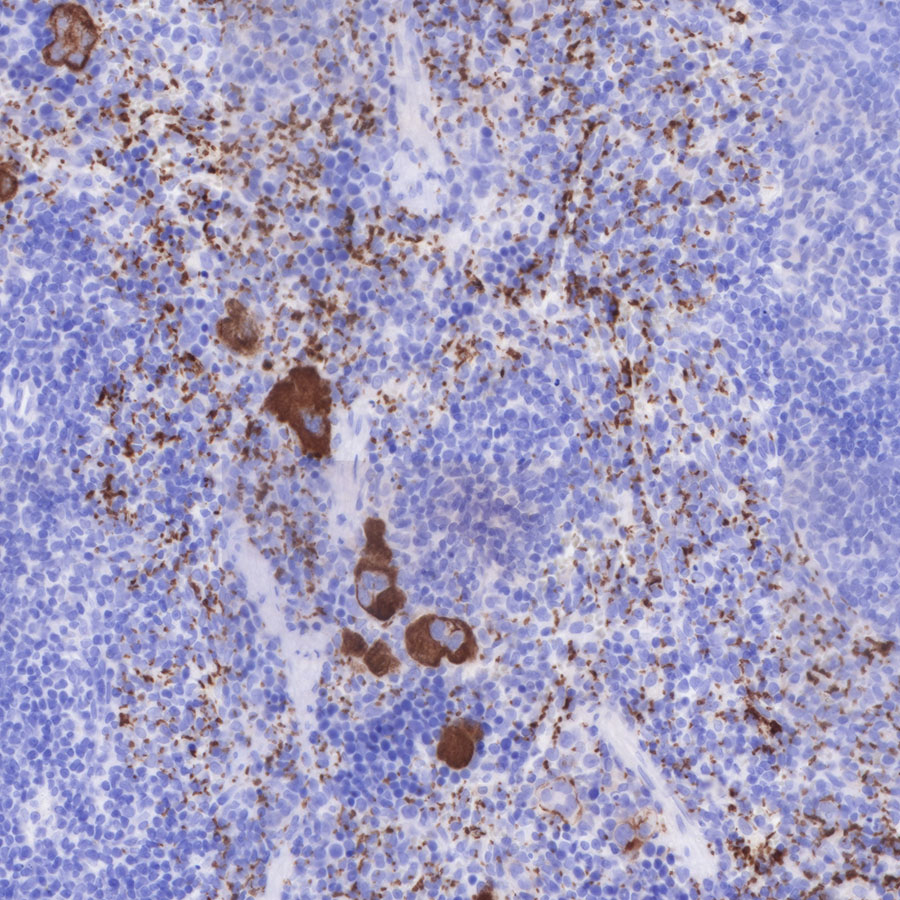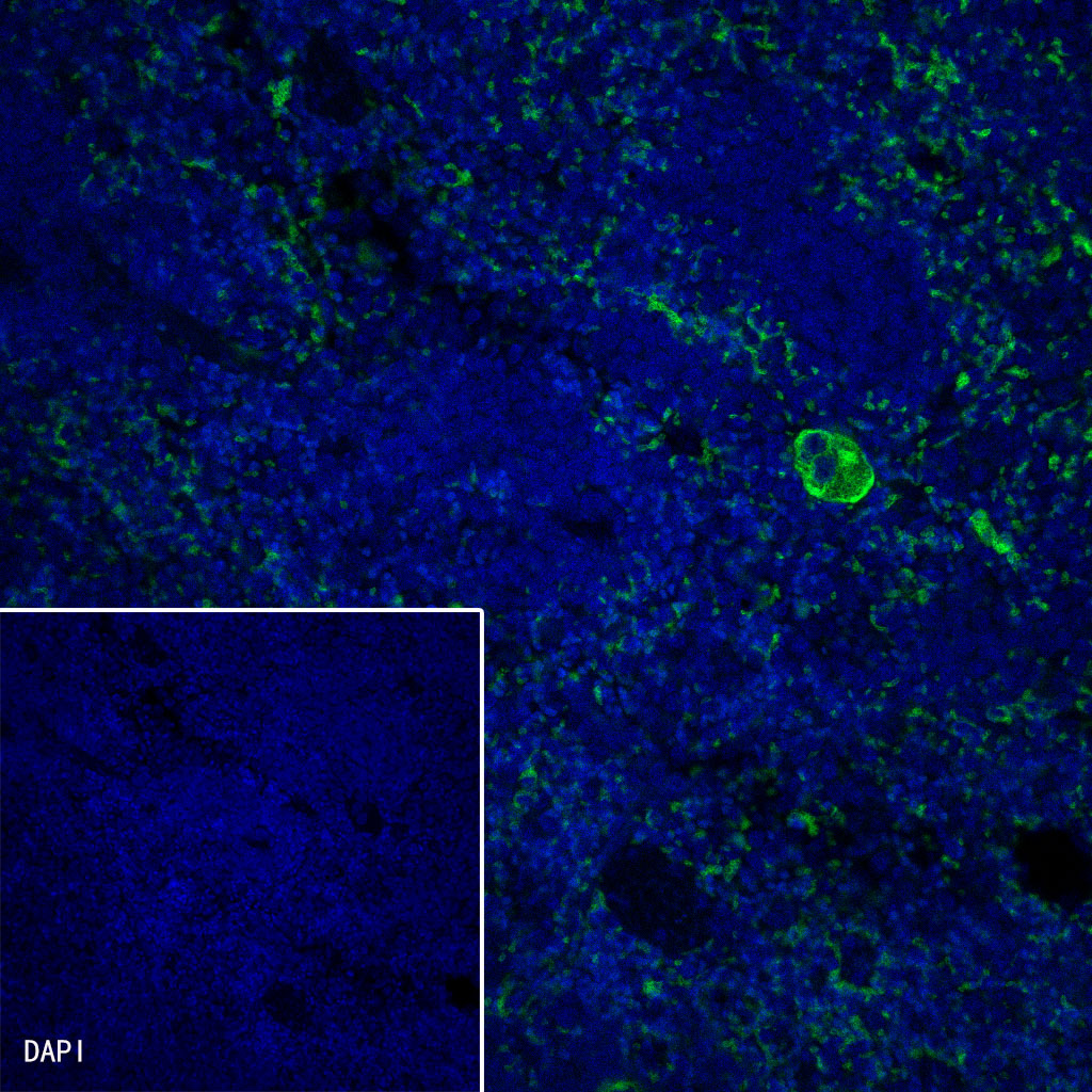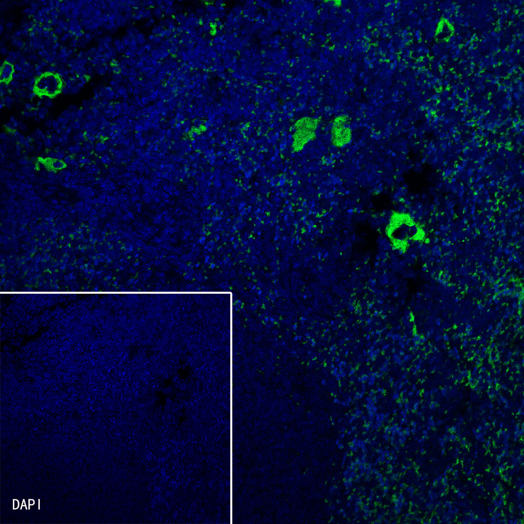 IF shows positive staining in paraffin-embedded rat spleen. Anti-CD42b antibody was used at 1/250 dilution (Green). Goat polyclonal Antibody to Rabbit IgG - H&L (Alexa Fluor® 488) was used as secondary antibody at 1/1000 dilution. Counterstained with DAPI (Blue). Heat mediated antigen retrieval with Tris/EDTA buffer pH9.0 was performed before commencing with IF staining protocol.