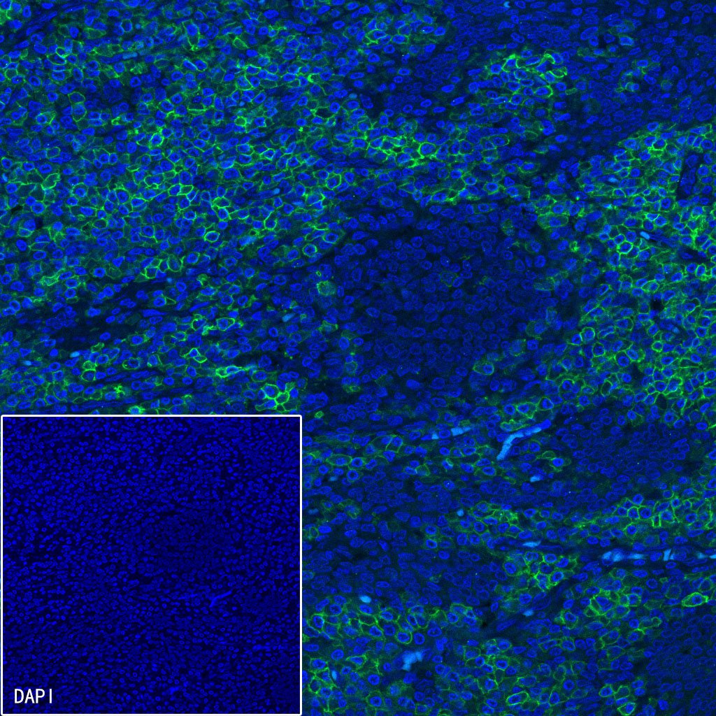 IF shows positive staining in paraffin-embedded human tonsil. Anti-CD5 (Alexa Fluor® 488 Conjugate) antibody was used at 1/200 dilution (Green) and incubated overnight at 4°C. Counterstained with DAPI (Blue). Heat mediated antigen retrieval with EDTA buffer pH9.0 was performed before commencing with IF staining protocol.