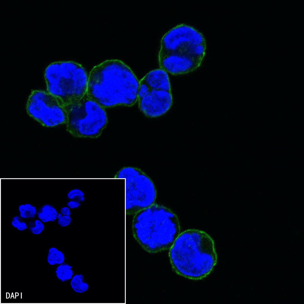 ICC shows positive staining in Molt-4 cells. Anti-CD5 antibody was used at 1/100 dilution (Green) and incubated overnight at 4°C. Goat polyclonal Antibody to Mouse IgG - H&L (Alexa Fluor® 488) was used as secondary antibody at 1/1000 dilution. The cells were fixed with 4%PFA and permeabilized with 0.1% PBS-Triton X-100. Nuclei were counterstained with DAPI (Blue).