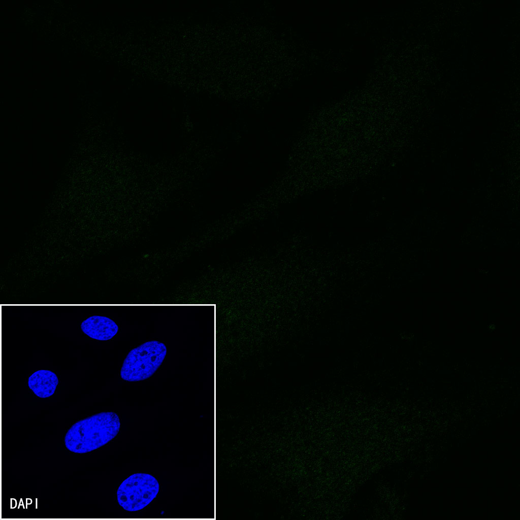 Negative control:ICC shows negative staining in HeLa cells. Anti-CD5 antibody was used at 1/100 dilution and incubated overnight at 4°C. Goat polyclonal Antibody to Mouse IgG - H&L (Alexa Fluor® 488) was used as secondary antibody at 1/1000 dilution. The cells were fixed with 4%PFA and permeabilized with 0.1% PBS-Triton X-100. Nuclei were counterstained with DAPI (Blue).