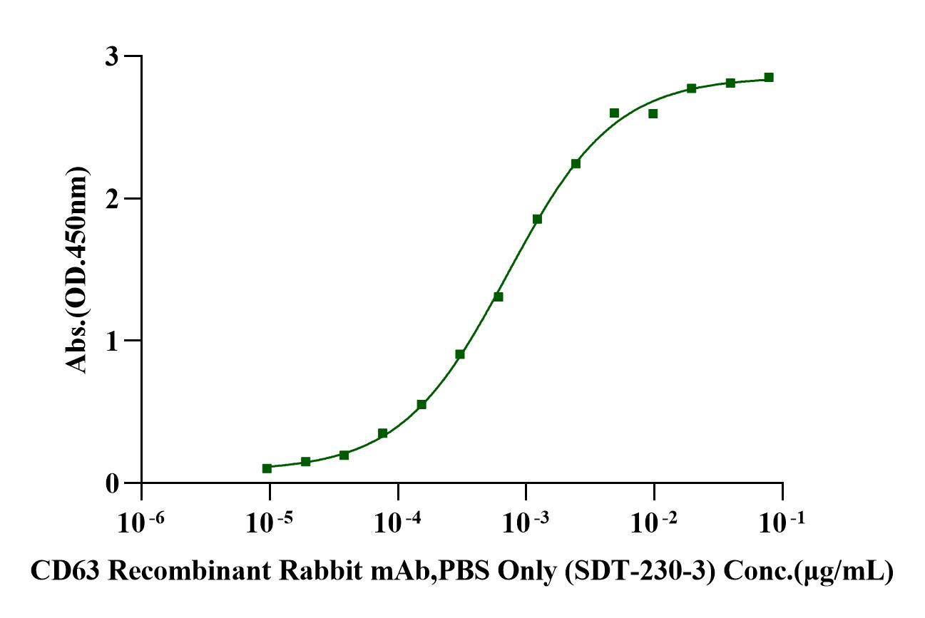 Immobilized CD63 His Tag Protein, Human (Cat. No. UA010505) at 2μg/mL (100μL/well) can bind CD63 Recombinant Rabbit mAb,PBS Only (SDT-230-3) (Cat. No. S0B2141P) with EC50 of 0.65-0.80ng/ml.