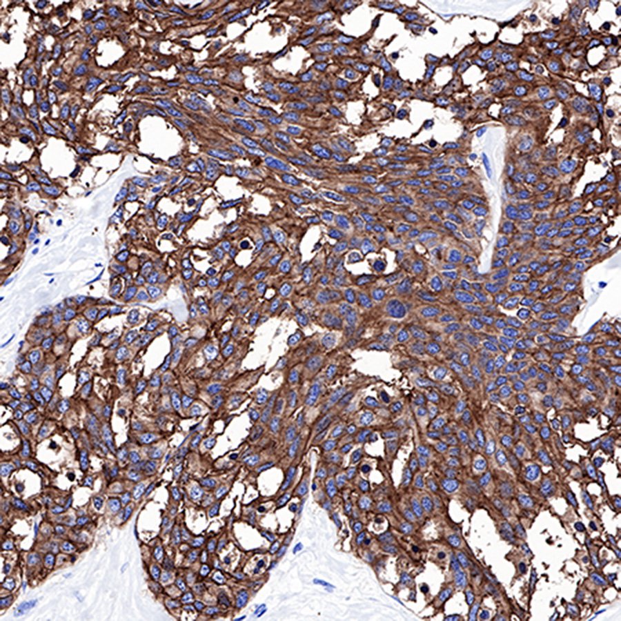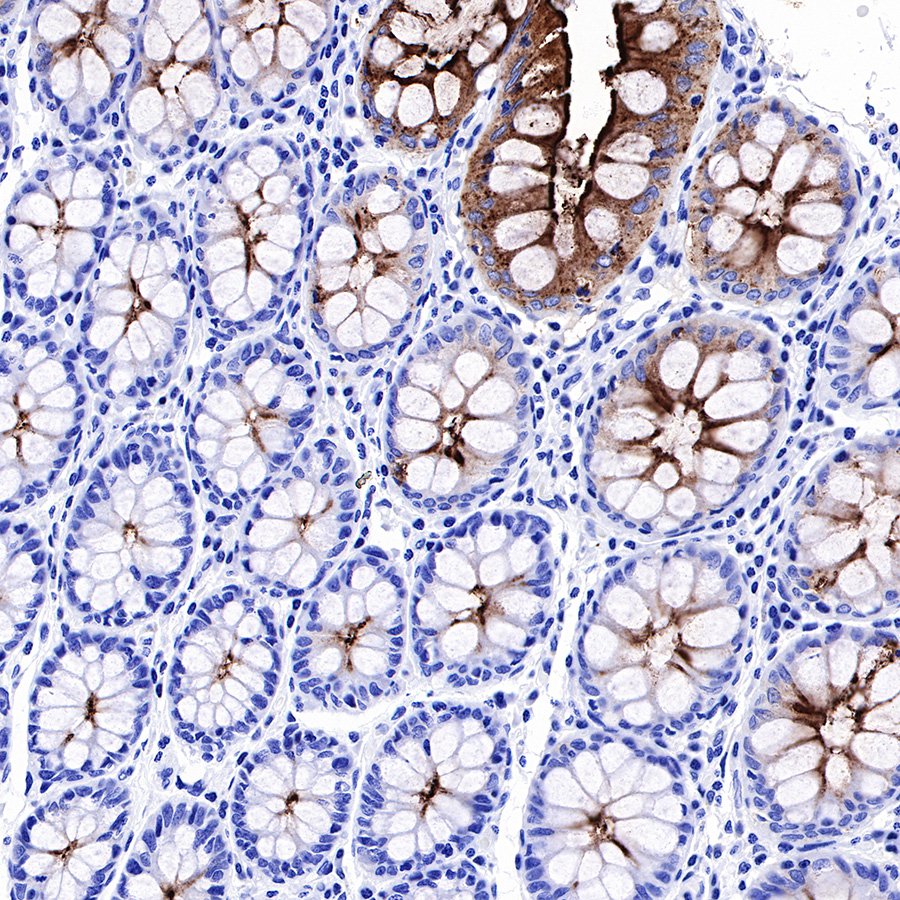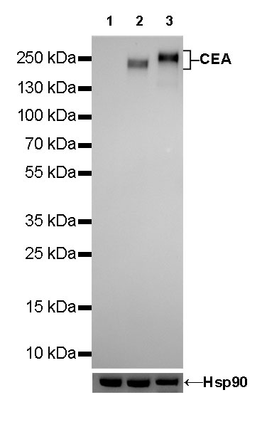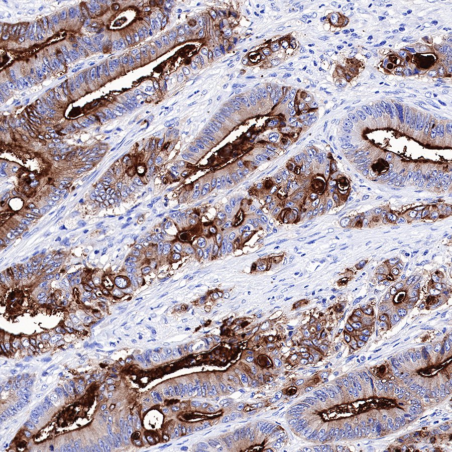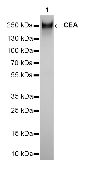 Carcinoembryonic antigen (CEA) describes a set of highly related glycoproteins involved in cell adhesion. CEA is normally produced in gastrointestinal tissue during fetal development, but the production stops before birth. CEA are glycosyl phosphatidyl inositol (GPI) cell-surface-anchored glycoproteins whose specialized sialofucosylated glycoforms serve as functional colon carcinoma L-selectin and E-selectin ligands, which may be critical to the metastatic dissemination of colon carcinoma cells. Immunologically they are characterized as members of the CD66 cluster of differentiation. The proteins include CD66a, CD66b, CD66c, CD66d, CD66e, CD66f.Consequently, CEA is usually present at very low levels in the blood of healthy adults (about 2–4 ng/mL). However, the serum levels are raised in some types of cancer. CEA is an important tumor marker for colorectal and some other carcinomas. The CEA subgroup members are cell membrane associated and show a complex expression pattern in normal and cancerous tissues with notably CEA showing a selective epithelial expression.