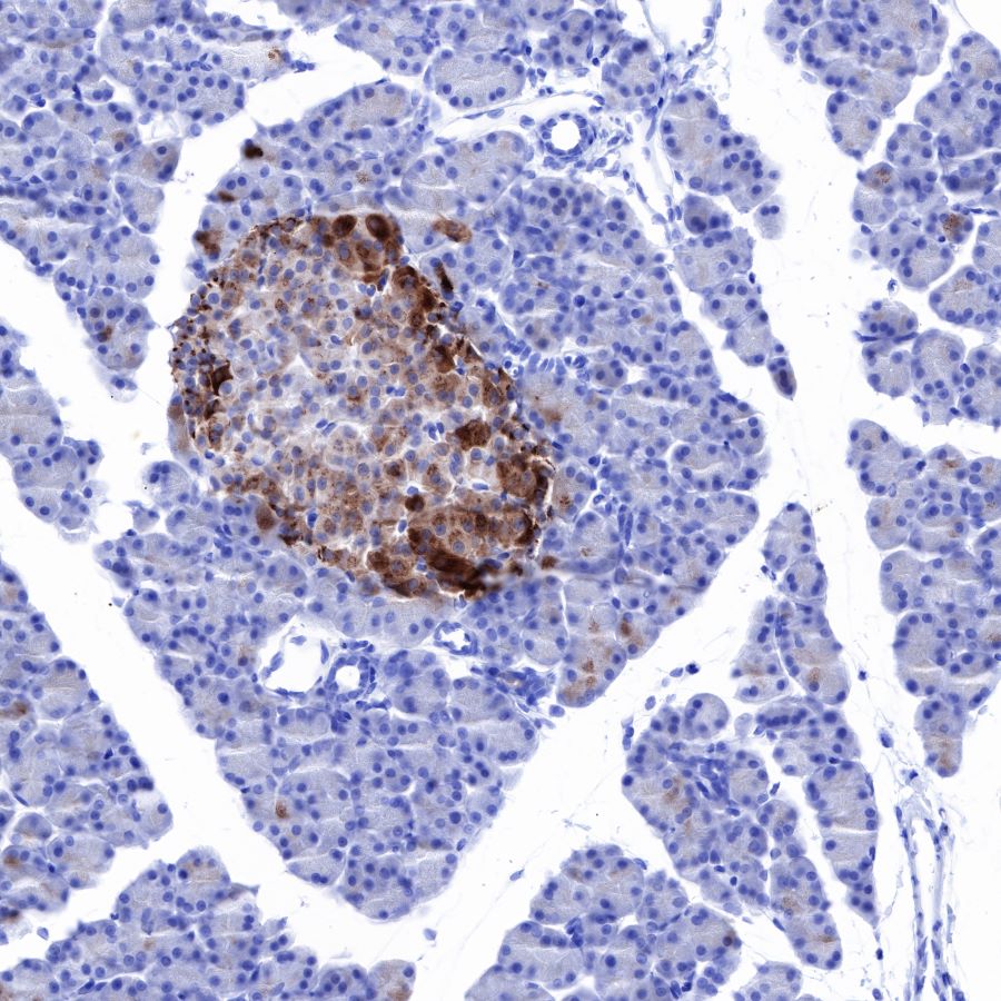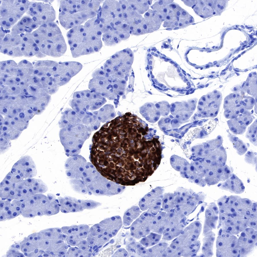 Chromogranin A or parathyroid secretory protein 1 (gene name CHGA) is a member of the granin family of neuroendocrine secretory proteins. As such, it is located in secretory vesicles of neurons and endocrine cells such as islet beta cell secretory granules in the pancreas. In humans, chromogranin A protein is encoded by the CHGA gene. Chromogranin A is the precursor to several functional peptides including vasostatin-1, vasostatin-2,pancreastatin, catestatin and parastatin. These peptides negatively modulate the neuroendocrine function of the releasing cell (autocrine) or nearby cells (paracrine). Chromogranin A induces and promotes the generation of secretory granules such as those containing insulin in pancreatic islet beta cells. Chromogranin A is elevated in pheochromocytomas. It is used as an indicator for pancreas and prostate cancer and in carcinoid syndrome. It might play a role in early neoplasic progression. Chromogranin A is cleaved by an endogenous prohormone convertase to produce several peptide fragments. In immunohistochemistry it can be used to identify a range of neuroendocrine tumours and is highly specific for both benign and malignant cells of this type.