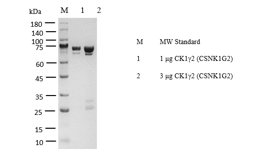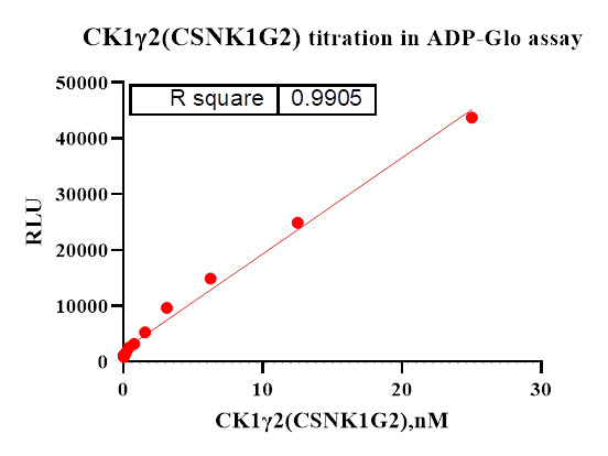 The CK1Γ2(CSNK1G2) activity was detected using Ultra Luminescence technology. The reaction was performed by incubating the CK1Γ2(CSNK1G2) protein , ATP and substrate at 25℃ for 60 min, then adding ADP-Glo reagent at 25℃ for 40 min and reading RLU signal with BMG.
