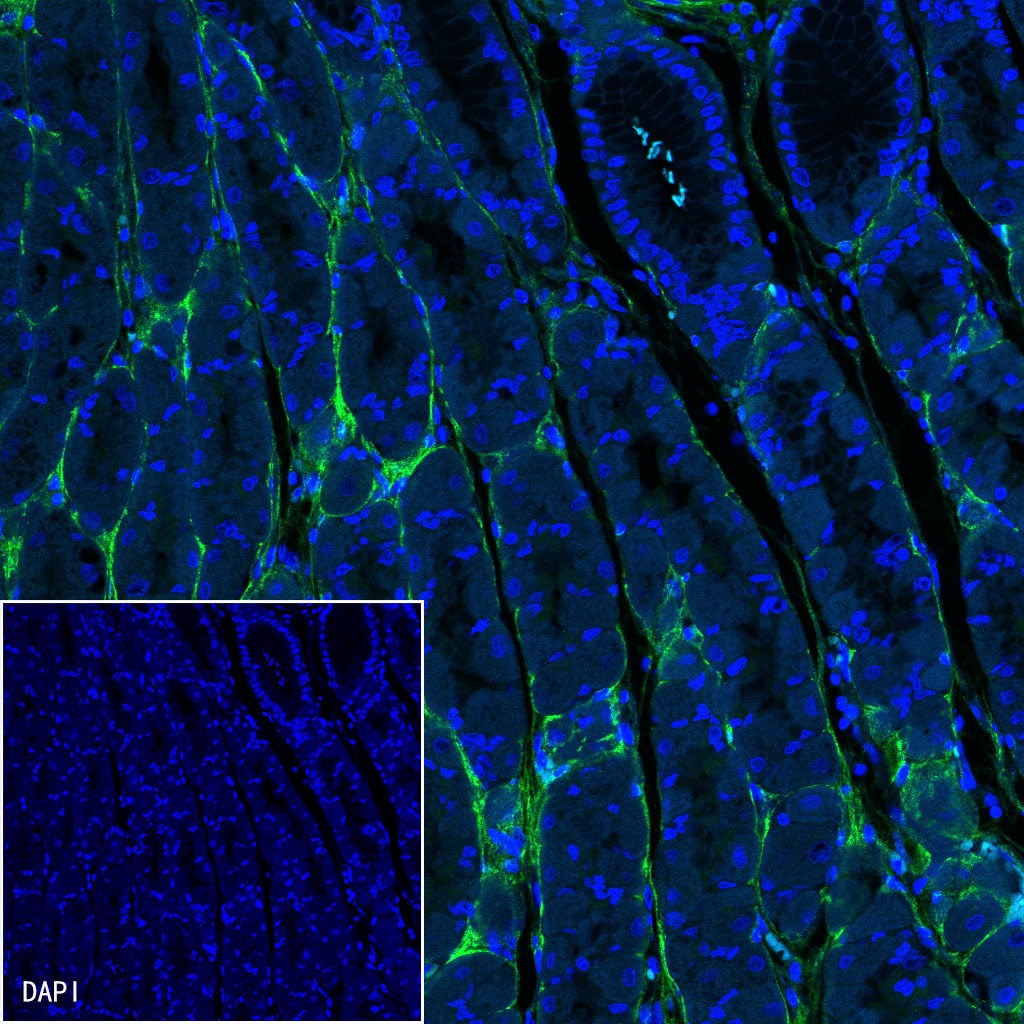 IF shows positive staining in paraffin-embedded human stomach. Anti-Gastrin antibody was used at 1/100 dilution (Green) and incubated overnight at 4°C. Goat polyclonal Antibody to Rabbit IgG - H&L (Alexa Fluor® 488) was used as secondary antibody at 1/1000 dilution. Counterstained with DAPI (Blue). Heat mediated antigen retrieval with EDTA buffer pH9.0 was performed before commencing with IF staining protocol.