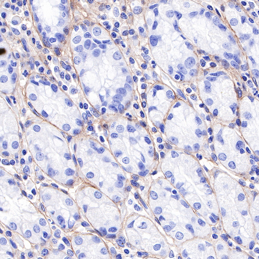 IHC shows positive staining in paraffin-embedded human stomach. Anti-COL3A1(PIIINP) antibody was used at 1/500 dilution, followed by a HRP Polymer for Mouse & Rabbit IgG (ready to use). Counterstained with hematoxylin. Heat mediated antigen retrieval with Tris/EDTA buffer pH9.0 was performed before commencing with IHC staining protocol.