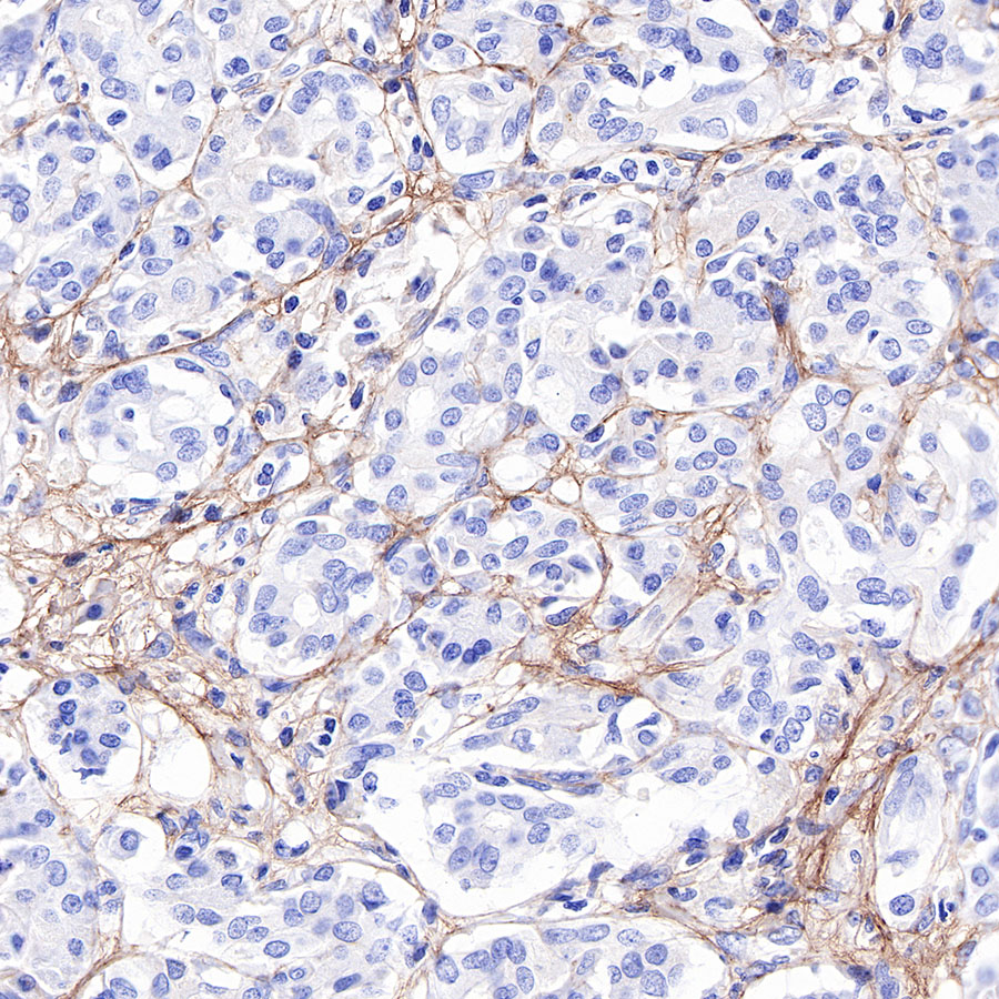 IHC shows positive staining in paraffin-embedded human lung squamous cell carcinoma. Anti-COL3A1(PIIINP) antibody was used at 1/500 dilution, followed by a HRP Polymer for Mouse & Rabbit IgG (ready to use). Counterstained with hematoxylin. Heat mediated antigen retrieval with Tris/EDTA buffer pH9.0 was performed before commencing with IHC staining protocol.