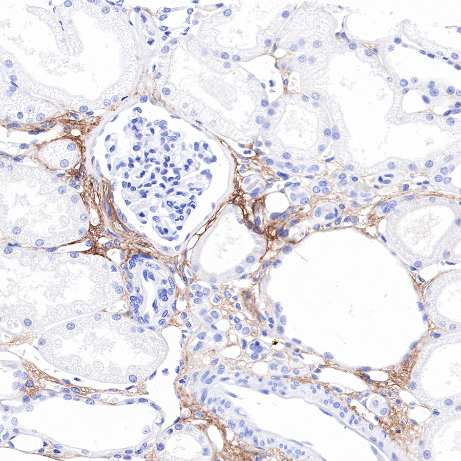 IHC shows positive staining in paraffin-embedded human kidney. Anti-COL3A1(PIIINP) antibody was used at 1/500 dilution, followed by a HRP Polymer for Mouse & Rabbit IgG (ready to use). Counterstained with hematoxylin. Heat mediated antigen retrieval with Tris/EDTA buffer pH9.0 was performed before commencing with IHC staining protocol.