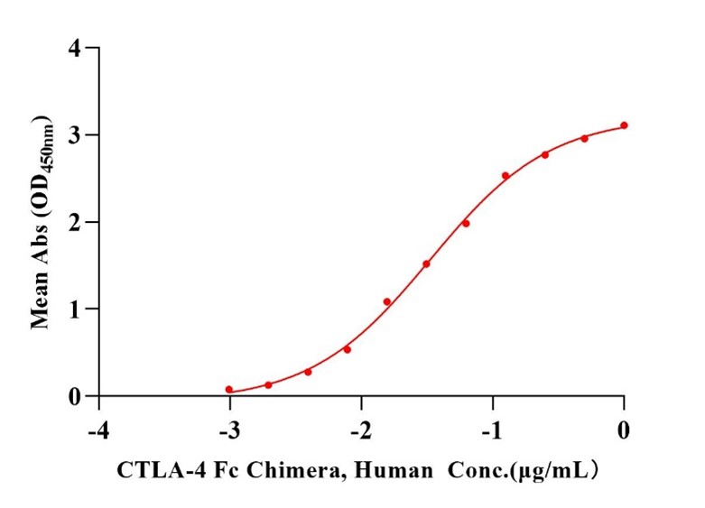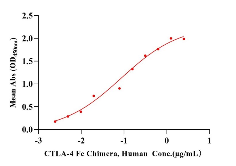 Immobilized B7-1/CD80 His Tag, Human (Cat. No. UA010085) at 5μg/mL (100 μL/well) can bind CTLA-4 Fc Chimera, Human (Cat. No. UA010039) with EC50 of 85.96ng/mL.
