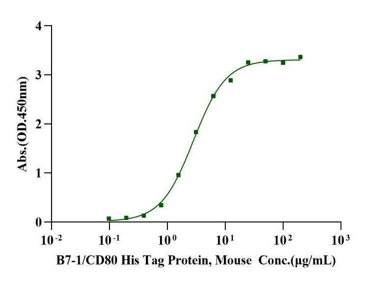Immobilized CTLA-4/CD152 Fc Chimera, Mouse  (Cat. No. UA010773) at 10.0μg/mL (100μL/well) can bind B7-1/CD80 His Tag Protein, Mouse (Cat. No. UA011082)  with EC50 of 2.56-3.13μg/mL.