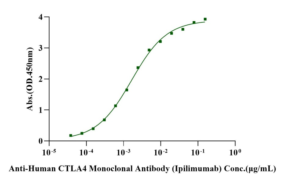 Immobilized CTLA-4/CD152 His Tag, Cynomolgus (Cat. No. UA010797)at 2.0μg/mL (100μL/well) can bind Anti-Human CTLA4 Monoclonal Antibody (Ipilimumab) with EC50 of 1.42-1.92ng/mL.