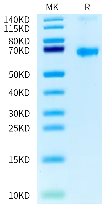 Predicted MW of 49.80 kDa. Due to glycosylation, the protein migrates to 60-70 kDa based on Bis-Tris PAGE result.