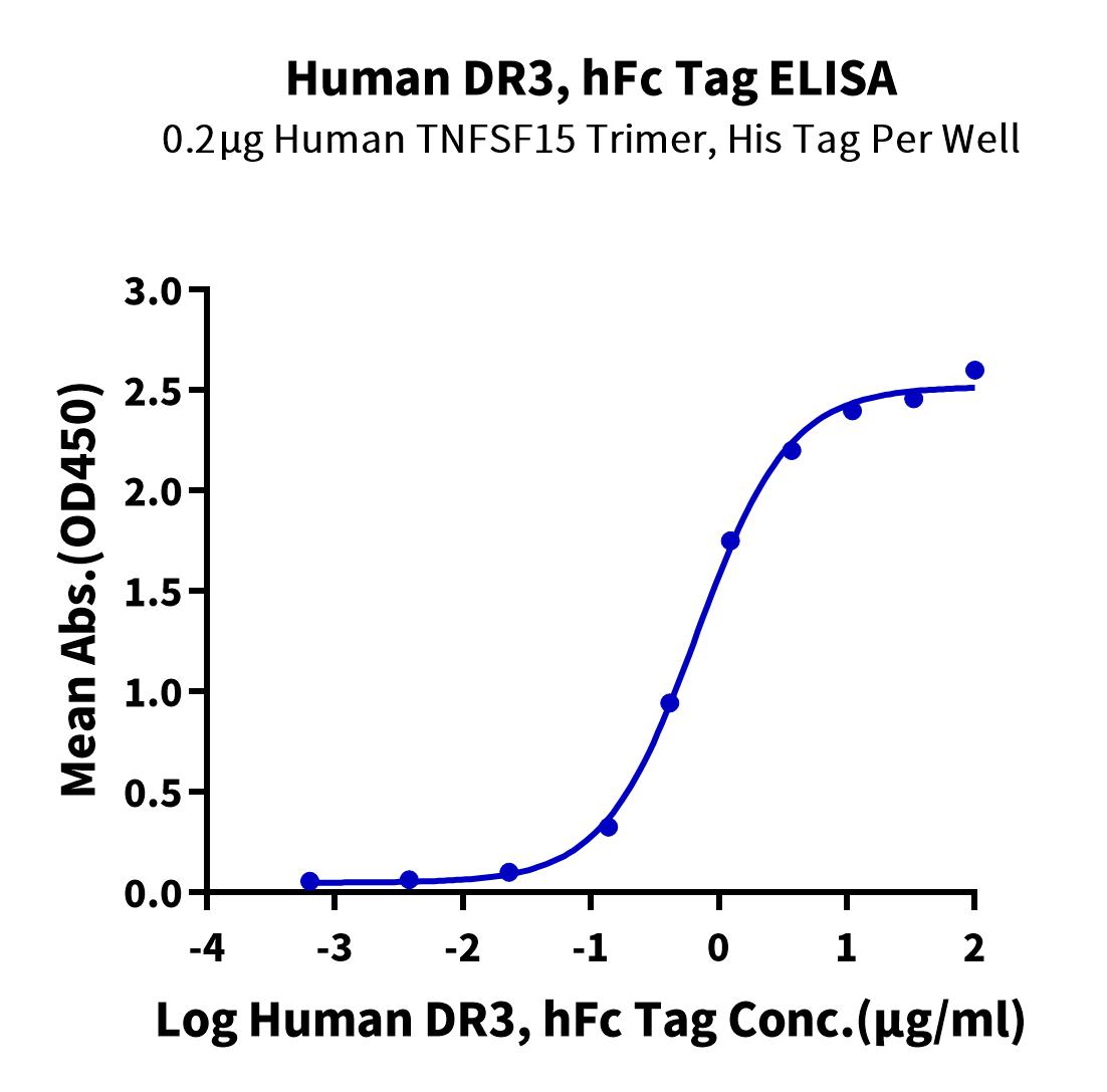 Immobilized Human TNFSF15 Trimer, His Tag at 2μg/ml (100μl/well) on the plate. Dose response curve for Human DR3, hFc Tag with the EC50 of 0.67μg/ml determined by ELISA.