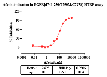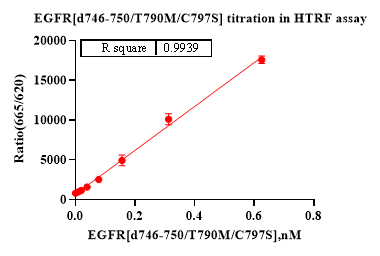 The EGFR[d746-750/T790M/C797S] activity was detected using HTRF technology. The reaction was performed by incubating the EGFR[d746-750/T790M/C797S] protein, ATP and substrate at 25℃ for 60 min, adding the beads at 25℃ for 60 min, then reading ratio 665/620 with BMG.