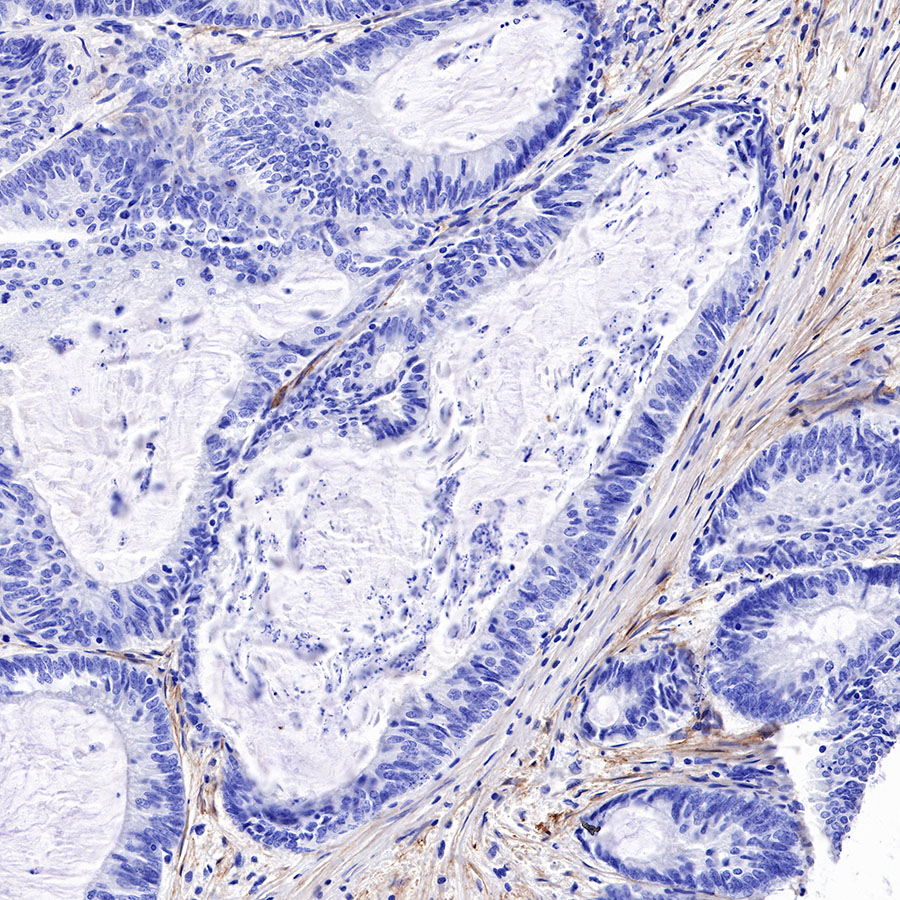 IHC shows positive staining in paraffin-embedded human colon cancer. Anti-FAP antibody was used at 1/500 dilution, followed by a HRP Polymer for Mouse & Rabbit IgG (ready to use). Counterstained with hematoxylin. Heat mediated antigen retrieval with Tris/EDTA buffer pH9.0 was performed before commencing with IHC staining protocol.