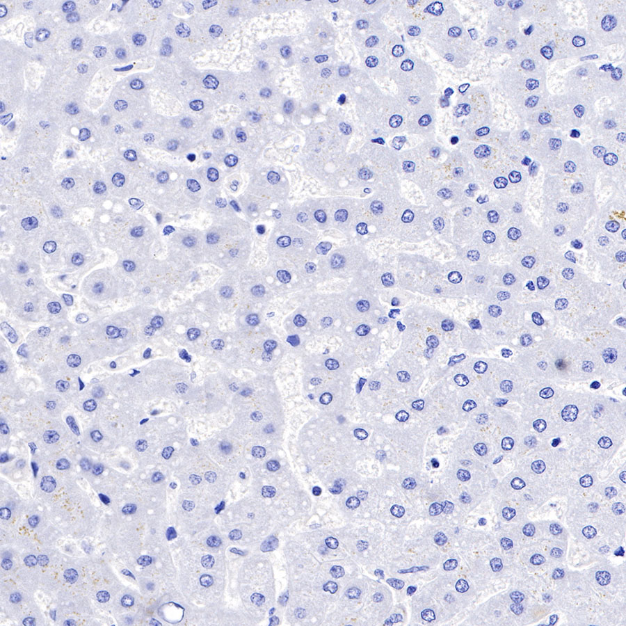 Negative control: IHC shows negative staining in paraffin-embedded human liver. Anti-FAP antibody was used at 1/500 dilution, followed by a HRP Polymer for Mouse & Rabbit IgG (ready to use). Counterstained with hematoxylin. Heat mediated antigen retrieval with Tris/EDTA buffer pH9.0 was performed before commencing with IHC staining protocol.