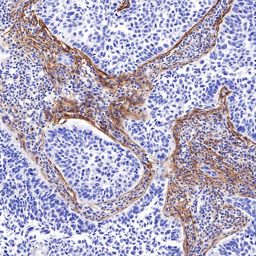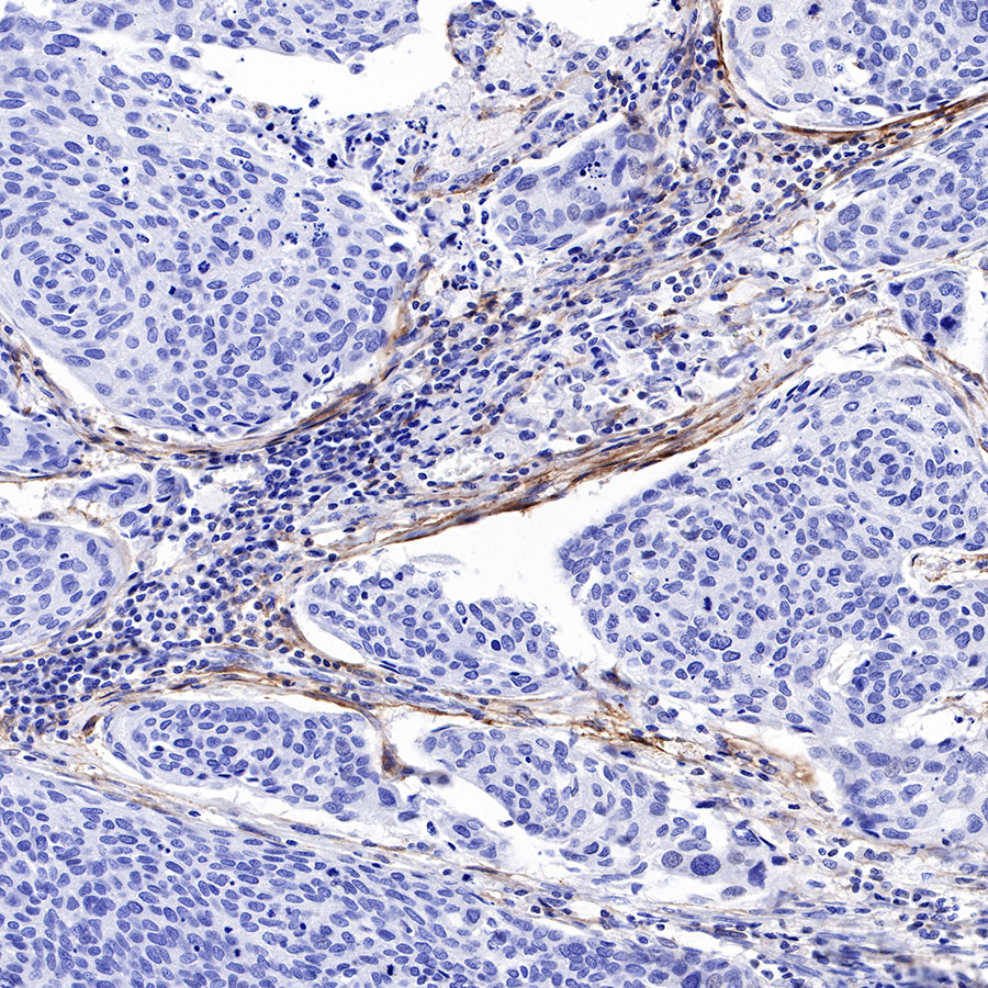 IHC shows positive staining in paraffin-embedded human cervical squamous cell carcinoma. Anti-FAP antibody was used at 1/500 dilution, followed by a HRP Polymer for Mouse & Rabbit IgG (ready to use). Counterstained with hematoxylin. Heat mediated antigen retrieval with Tris/EDTA buffer pH9.0 was performed before commencing with IHC staining protocol.