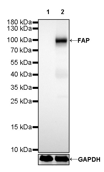 WB result of FAP Rabbit mAb Primary antibody: FAP Rabbit mAb at 1/1000 dilution Lane 1: SK-MEL-28 whole cell lysate 20 µg Lane 2: HFF whole cell lysate 20 µg Low expression control: SK-MEL-28 whole cell lysate Secondary antibody: Goat Anti-Rabbit IgG, (H+L), HRP conjugated at 1/10000 dilution Predicted MW: 87 kDa Observed MW: 95 kDa