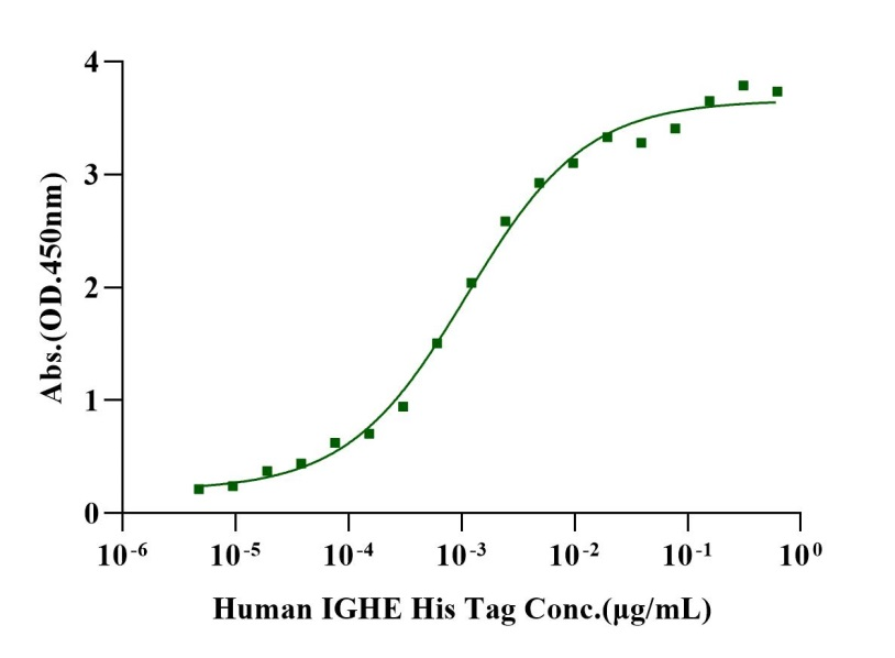 Immobilized Fc epsilon RI α Fc Chimera, Human (Cat. No. UA010147) at 0.5μg/mL (100μL/well) can bind Human IGHE His Tag with EC50 of 0.88-1.40 ng/mL.