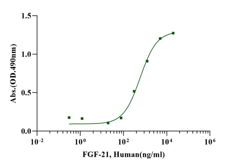 Fibroblast Growth Factor 21(FGF-21) is a member of the fibroblast growth factor (FGF) family and it is involved in the modulation of cell proliferation, growth, and differentiation as well as cell metabolism. This protein is a secreted endocrine factor that functions as a major metabolic regulator, and stimulates the uptake of glucose in adipose tissue. FGF21 binds to FGFR1c complexed with β-Klotho expressed in adipocytes to activate the canonical FGF signaling pathway (ERK1/2) and the AMPK/PGC1α pathway. Therefore, FGF-21 is being pursued as a therapeutic target for diabetes and obesity.