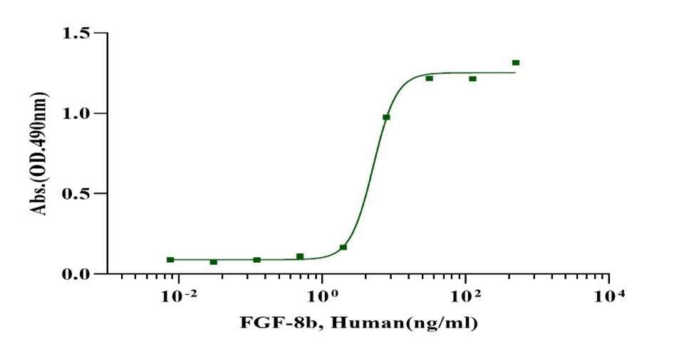 Fibroblast growth factor 8b (FGF-8b), a secreted heparin-binding protein, is a member of the fibroblast growth factor (FGF) family and is an isoform of FGF-8. Alternative splicing of fgf-8 gene gives rise to potentially four (a, b, e, f) different protein isoforms in human, and FGF-8b exhibits the highest transforming activity in NIH3T3 cells. FGF-8b signals through FGF receptors (FGFRs) to activate PI3K and MAPK pathways. FGF-8b is broadly associated with mitogenic and cell survival activities, and regulates gastrulation, epithelial-mesenchymal transition, and later on mesenchymal to epithelial differentiation during embryonic development. FGF-8b has also been found in peripheral blood leukocytes and healthy bone marrow samples.
