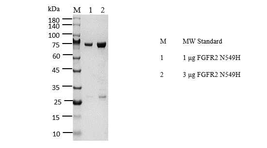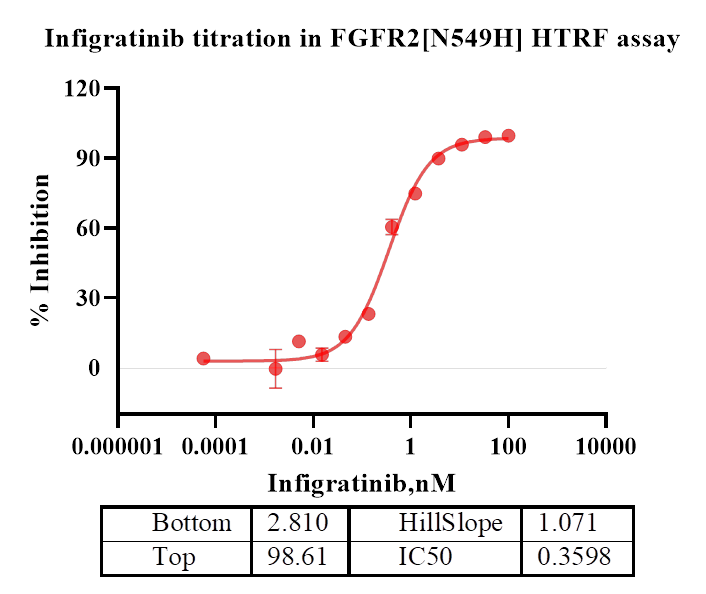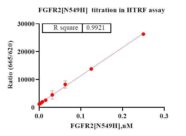 The FGFR2 N549H activity was detected using HTRF technology. The reaction was performed by incubating the FGFR2 N549H protein, ATP and substrate at 25℃ for 60 min, adding the beads at 25℃ for 60 min, then reading ratio 665/620 with BMG.