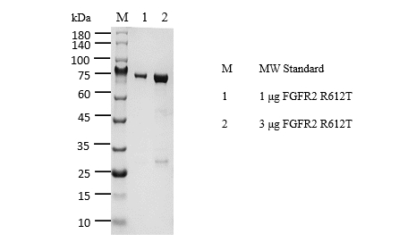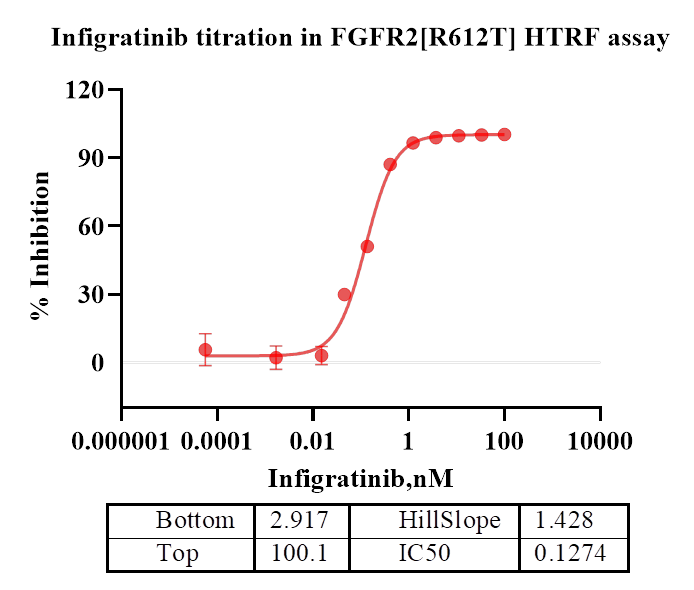 The FGFR2 R612T activity was detected using HTRF technology. The reaction was performed by incubating the FGFR2 R612T protein , ATP and substrate at 25℃ for 60 min, adding the beads at 25℃ for 60 min, then reading ratio 665/620 with BMG.