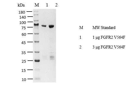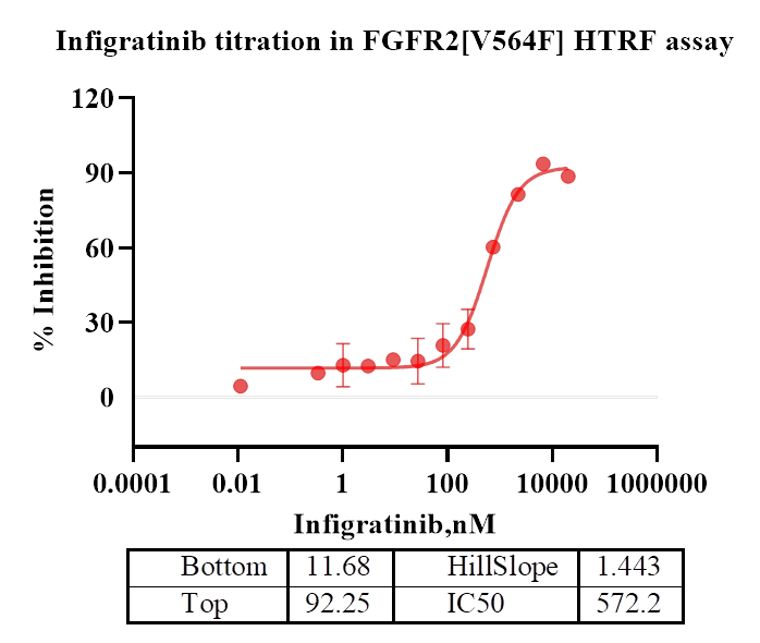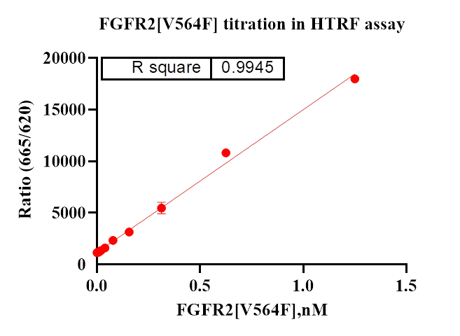The FGFR2 V564F activity was detected using HTRF technology. The reaction was performed by incubating the FGFR2 V564F protein, ATP and substrate at 25℃ for 60 min, adding the beads at 25℃ for 60 min, then reading ratio 665/620 with BMG.