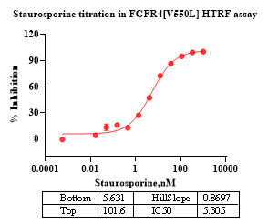 The FGFR4[V550L] activity was detected using HTRF technology. The reaction was performed by incubating the FGFR4 [V550L] protein, ATP and substrate at 25℃ for 60 min, adding the beads at 25℃ for 60 min, then reading ratio 665/620 with BMG.