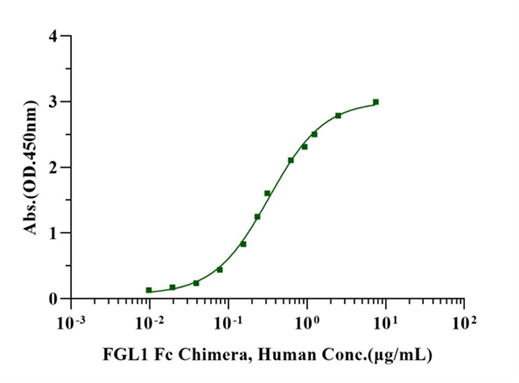 Immobilized LAG-3/CD223 His Tag, Human (Cat. No. UA010102) at 1.5μg/ml (100μl/well) can bind FGL1 Fc Chimera, Human (Cat. No. UA010251) with EC50 of 0.29-0.38μg/ml.