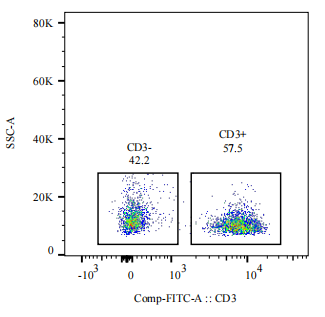 Human Blood samples were cleaved red/hemolytic (abs9101) and stained with FITC Mouse anti-Human CD3 Antibody(7F5) reagent. The cells were blocked with Human FCR Blocking Reagent (abs9476) before staining. Signals were collected on BD LSR® flow cytometer, lymphocyte gating was performed by FSC/SSC, and relevant data analysis was completed by FlowJo®.