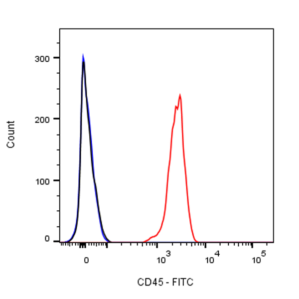 Flow cytometric analysis of Human CD45 expression on human PBMC (human peripheral blood mononuclear cell). Human PBMC were stained with either FITC Mouse IgG1, κ Isotype Control (Black line histogram) or SDT FITC Mouse Anti-Human CD45 Antibody (Red line histogram) at 0.25 μg/test, cells without incubation with primary antibody and secondary antibody (Blue line histogram) was used as unlabelled control. Flow cytometry and data analysis were performed using BD FACSymphony™ A1 and FlowJo™ software.