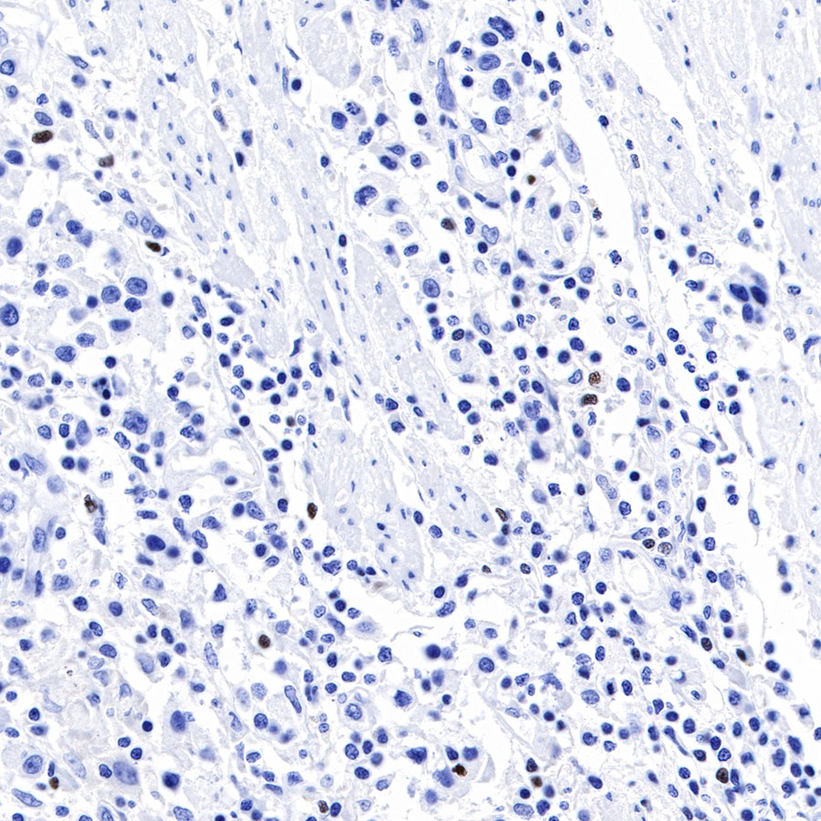 IHC shows positive staining in paraffin-embedded human gastric cancer. Anti-FOXP3 antibody was used at 1/250 dilution, followed by a HRP Polymer for Mouse & Rabbit IgG (ready to use). Counterstained with hematoxylin. Heat mediated antigen retrieval with Tris/EDTA buffer pH9.0 was performed before commencing with IHC staining protocol.
