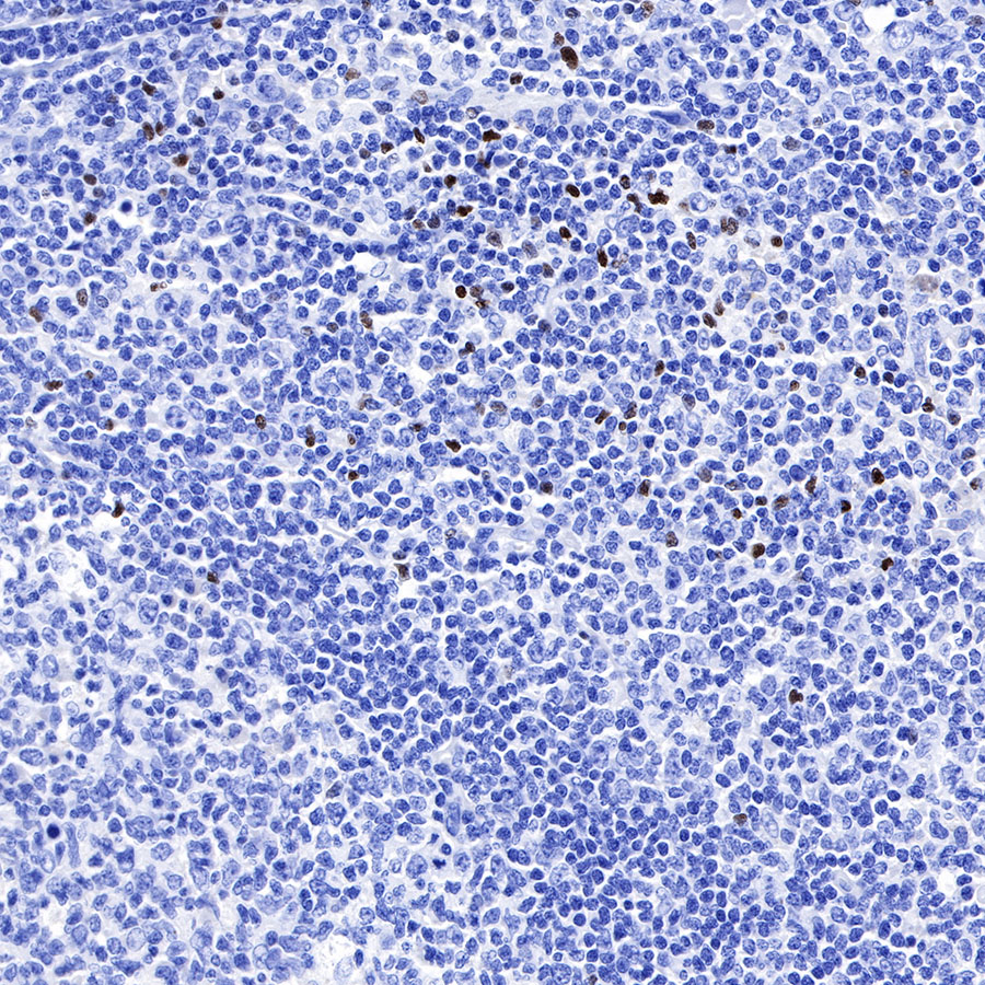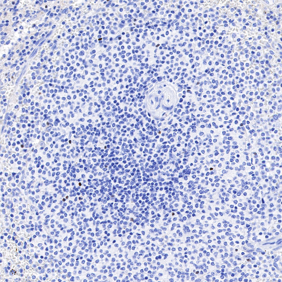 IHC shows positive staining in paraffin-embedded human spleen. Anti-FOXP3 antibody was used at 1/250 dilution, followed by a HRP Polymer for Mouse & Rabbit IgG (ready to use). Counterstained with hematoxylin. Heat mediated antigen retrieval with Tris/EDTA buffer pH9.0 was performed before commencing with IHC staining protocol.
