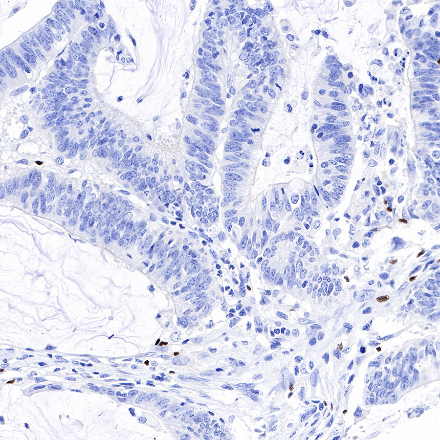 IHC shows positive staining in paraffin-embedded human colon cancer. Anti-FOXP3 antibody was used at 1/250 dilution, followed by a HRP Polymer for Mouse & Rabbit IgG (ready to use). Counterstained with hematoxylin. Heat mediated antigen retrieval with Tris/EDTA buffer pH9.0 was performed before commencing with IHC staining protocol.