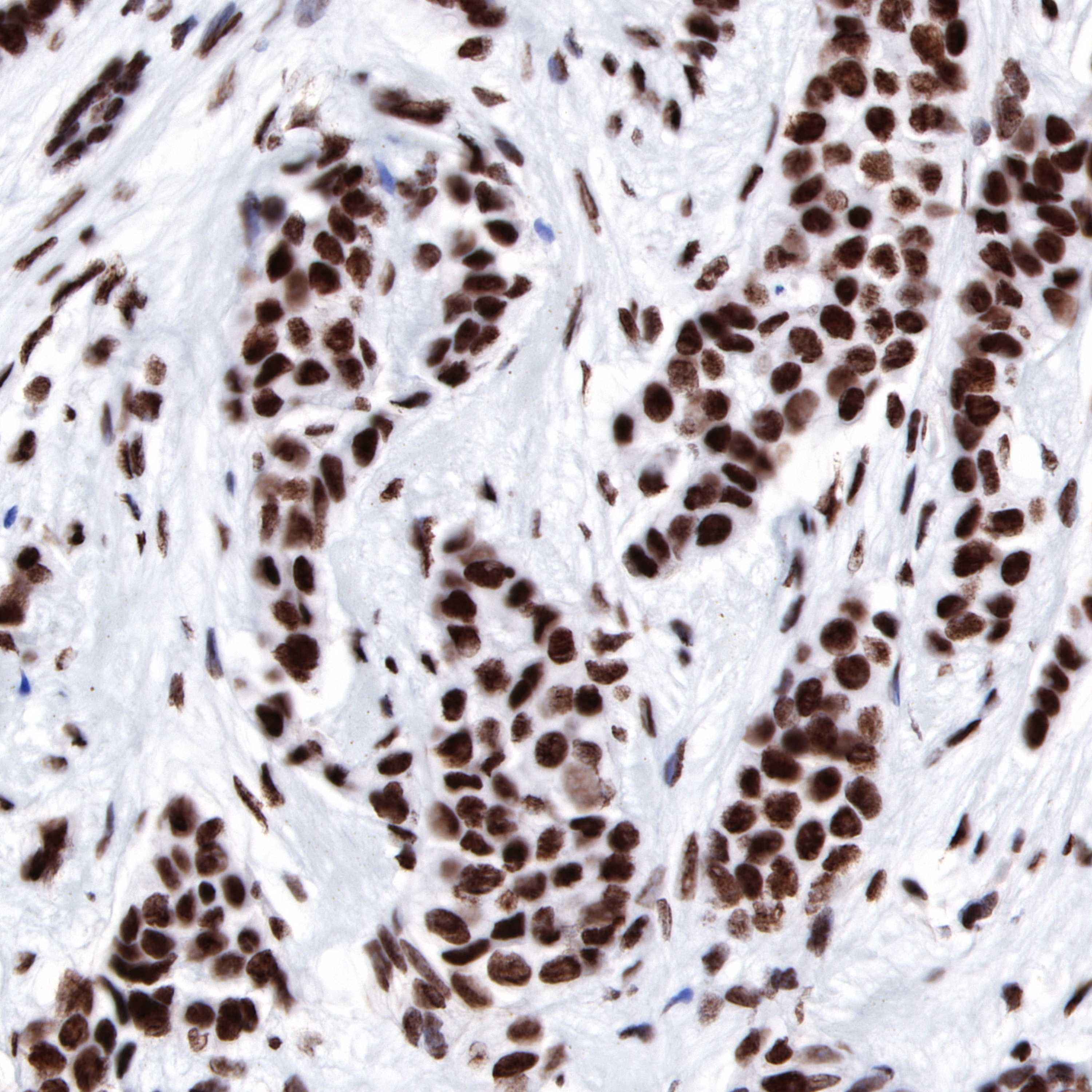 IHC shows positive staining in paraffin-embedded human breast carcinoma. Anti-FUBP1 antibody was used at 1/1000 dilution, followed by a HRP Polymer for Mouse & Rabbit IgG (ready to use). Counterstained with hematoxylin. Heat mediated antigen retrieval with Tris/EDTA buffer pH9.0 was performed before commencing with IHC staining protocol.