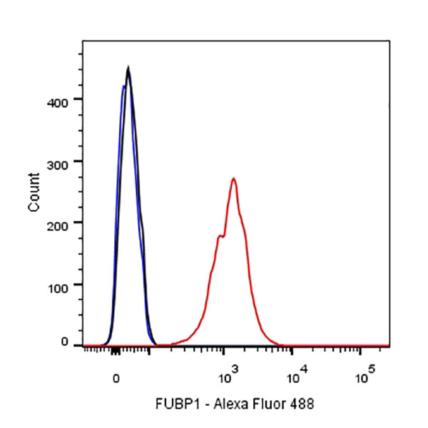 Flow cytometric analysis of HeLa cells labelling FUBP1 antibody at 1/500 (0.1 μg) dilution/ (red) compared with a Rabbit monoclonal IgG (Black) isotype control and an unlabelled control (cells without incubation with primary antibody and secondary antibody) (Blue). Goat Anti-Rabbit IgG Alexa Fluor® 488 was used as the secondary antibody.
