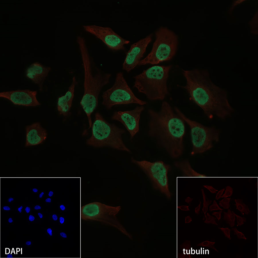 ICC shows positive nuclear staining in HeLa cells. Anti-FUBP1 antibody was used at 1/500 dilution and incubated overnight at 4°C. Goat polyclonal Antibody to Rabbit IgG - H&L (Alexa Fluor® 488) was used as secondary antibody at 1/1000 dilution.The cells were fixed with 4% PFA and permeabilized with 0.1% PBS-Triton X-100. Nuclei were counterstained with DAPI. Counter stain with tubulin (red).
