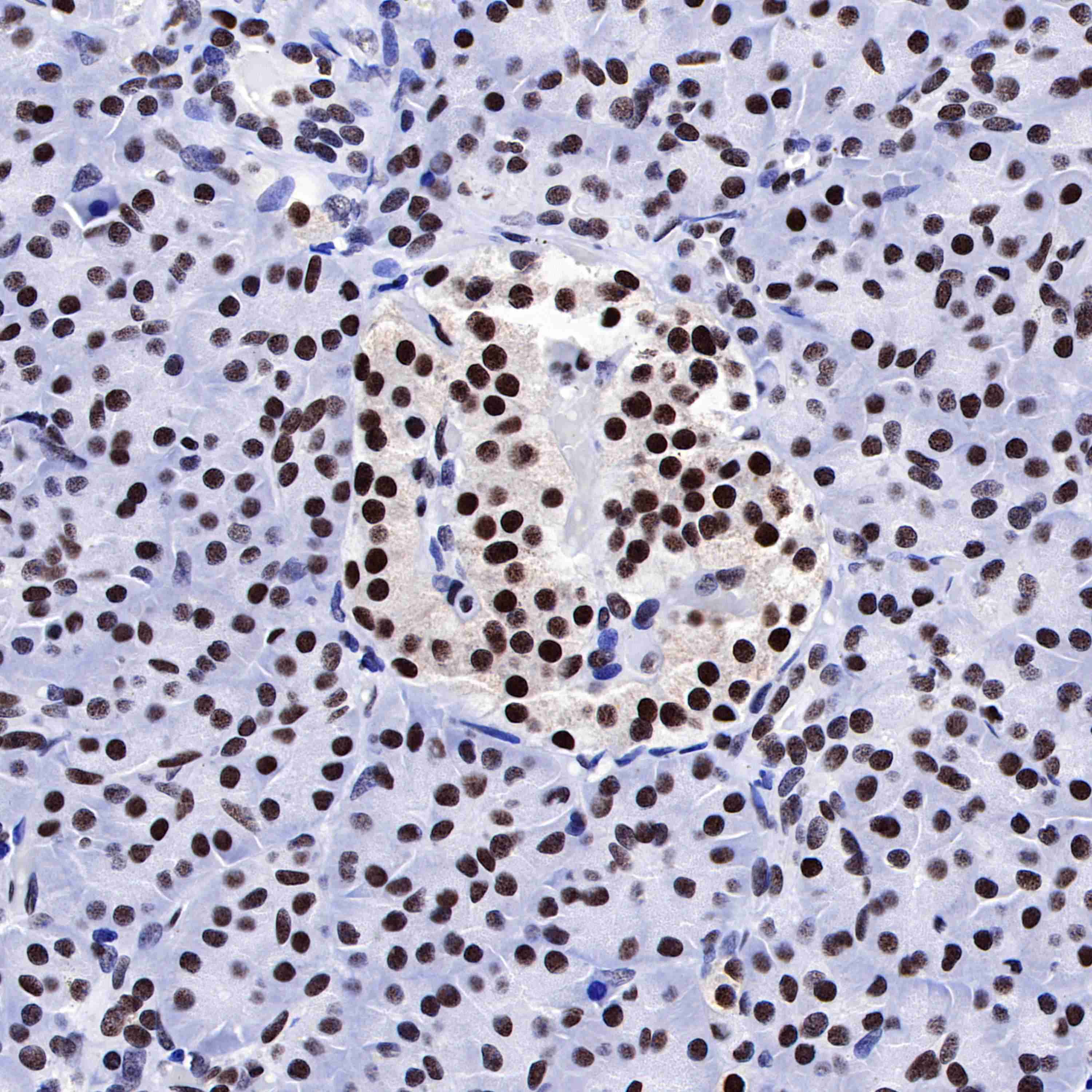 IHC shows positive staining in paraffin-embedded human pancreas. Anti-FUBP1 antibody was used at 1/1000 dilution, followed by a HRP Polymer for Mouse & Rabbit IgG (ready to use). Counterstained with hematoxylin. Heat mediated antigen retrieval with Tris/EDTA buffer pH9.0 was performed before commencing with IHC staining protocol.