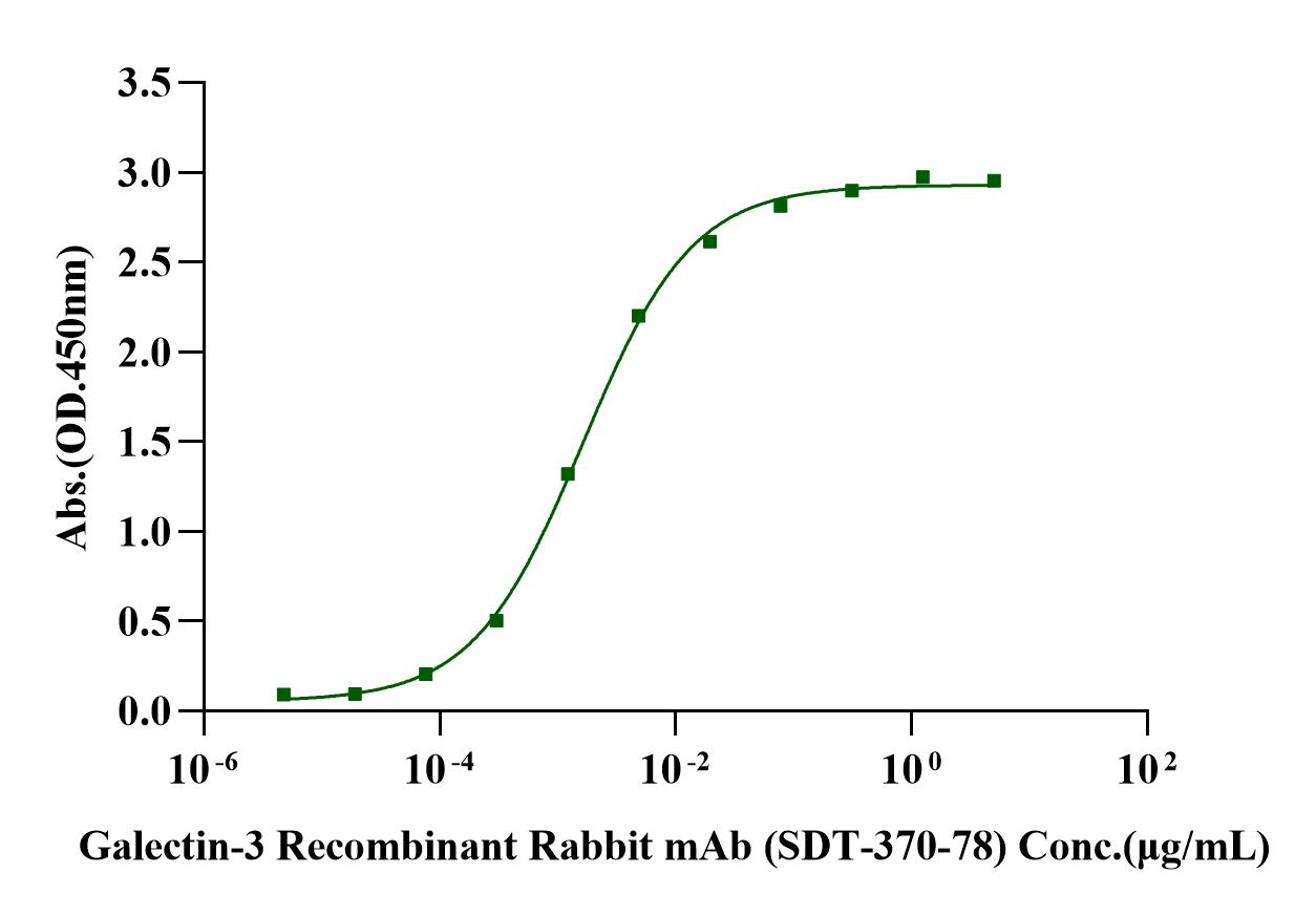 Immobilized Galectin-3, Human  (Cat. No. UA010163) at 2.0μg/mL (100μL/well) can bind Galectin-3 Recombinant Rabbit mAb (SDT-370-78) (Cat. No. S0B3134)  with EC50 of 1.43-1.88ng/mL.