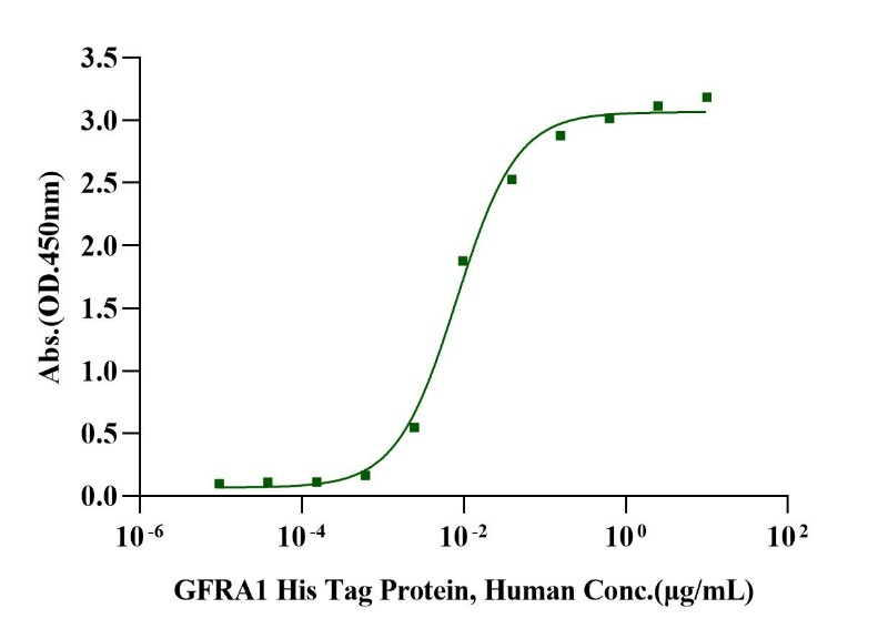 Immobilized GDNF Protein, Human (Cat. No. UA040211) at 0.5μg/mL (100μL/well) can bind GFRA1 His Tag Protein, Human (Cat. No. UA010524) with EC50 of 6.16-10.92ng/mL.
