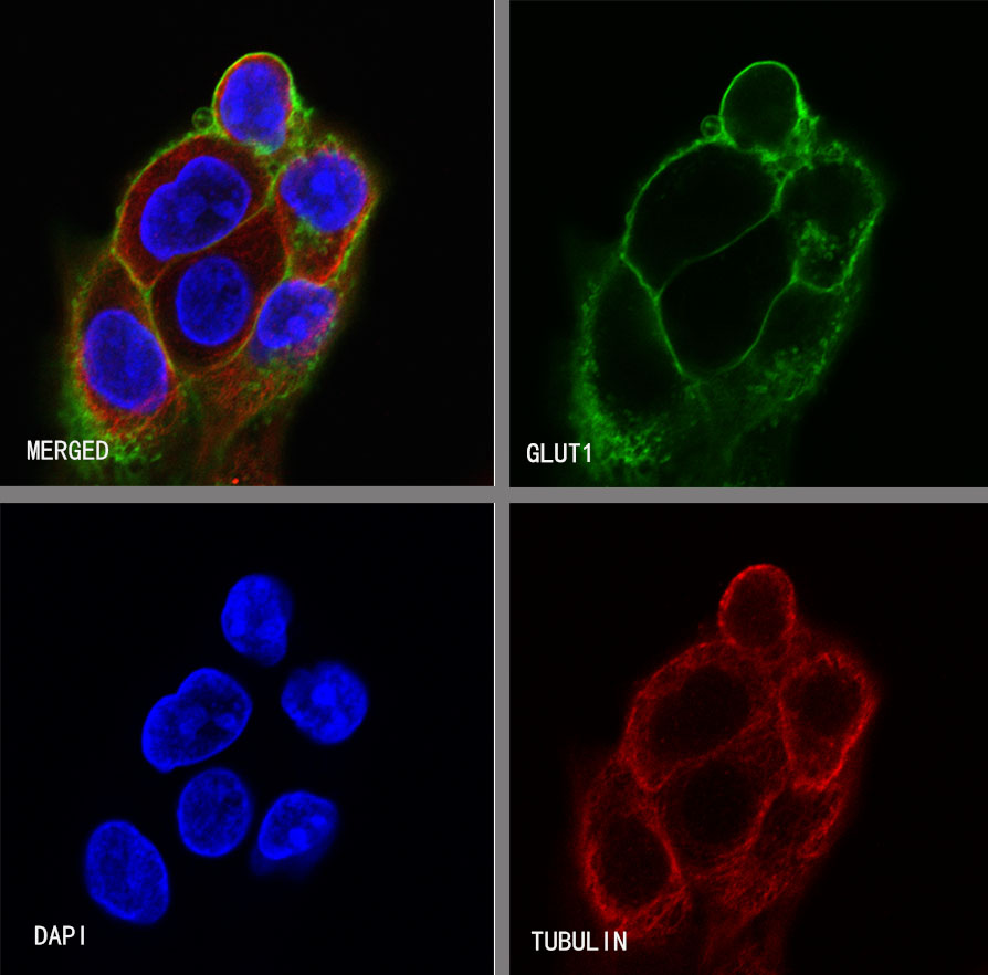 ICC shows positive staining in HepG2 cells. Anti-GLUT1 antibody was used at 1/250 dilution (Green) and incubated overnight at 4°C. Goat polyclonal Antibody to Rabbit IgG - H&L (Alexa Fluor® 488) was used as secondary antibody at 1/1000 dilution. The cells were fixed with 100% ice-cold methanoland permeabilized with 0.1% PBS-Triton X-100. Nuclei were counterstained with DAPI (Blue).Counterstain with tubulin (Red).